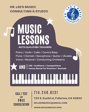 Dr. Lee's Music Consulting is a music school located in Fullerton, CA, providing various music lessons. Our teachers are registered with renowned music organizations such as the National Association of Teachers of Singing and the Music Teachers' Association of California to provide our students with credential-level tests, awards, and various performance chances. We also have over 20 years of experience, so you can rest assured that you will receive comprehensive, complete music education. We never compromise on quality, and our services are always executed with precision and care.